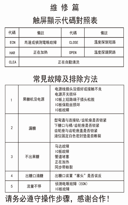 •市面上大部分果糖机,不可使用果糖以外没有粘稠度的液体,忌用清水清洗果糖机或在没有果糖时空转机器 。